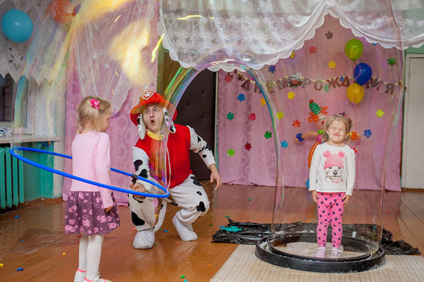 - Погружение детей и взрослых в гигантский мыльный пузырь
